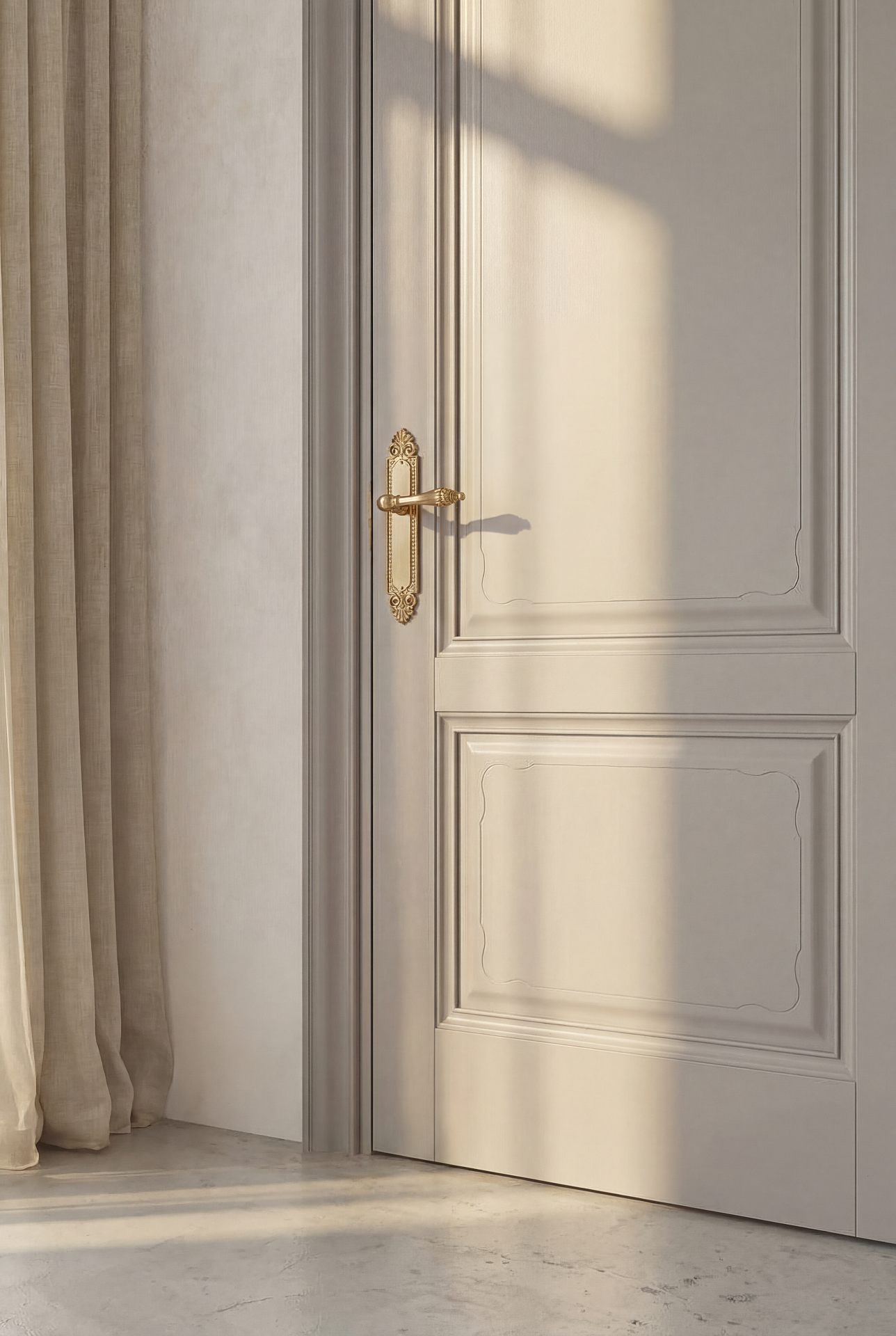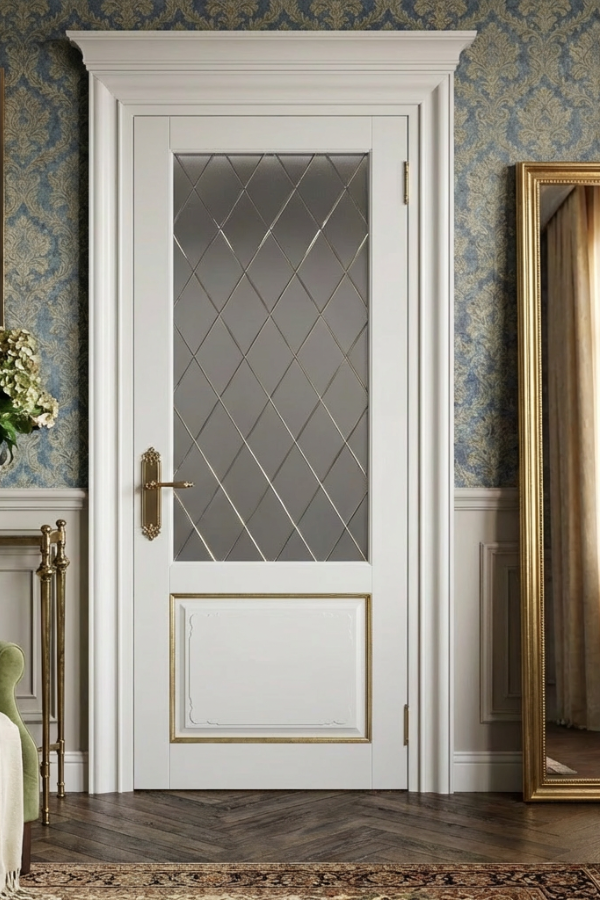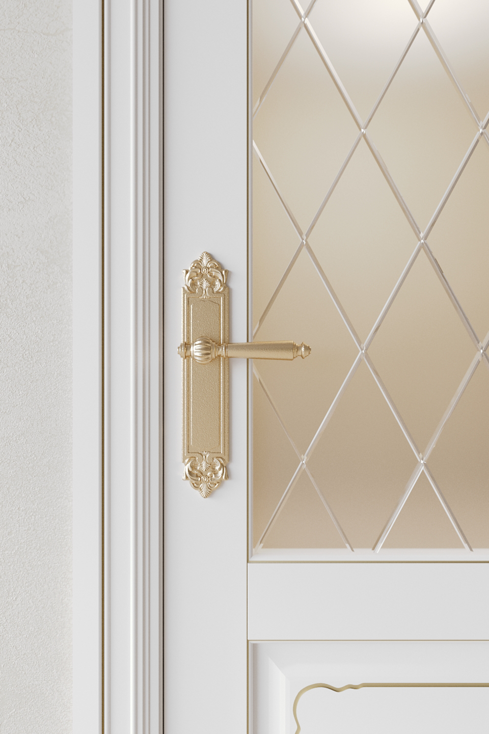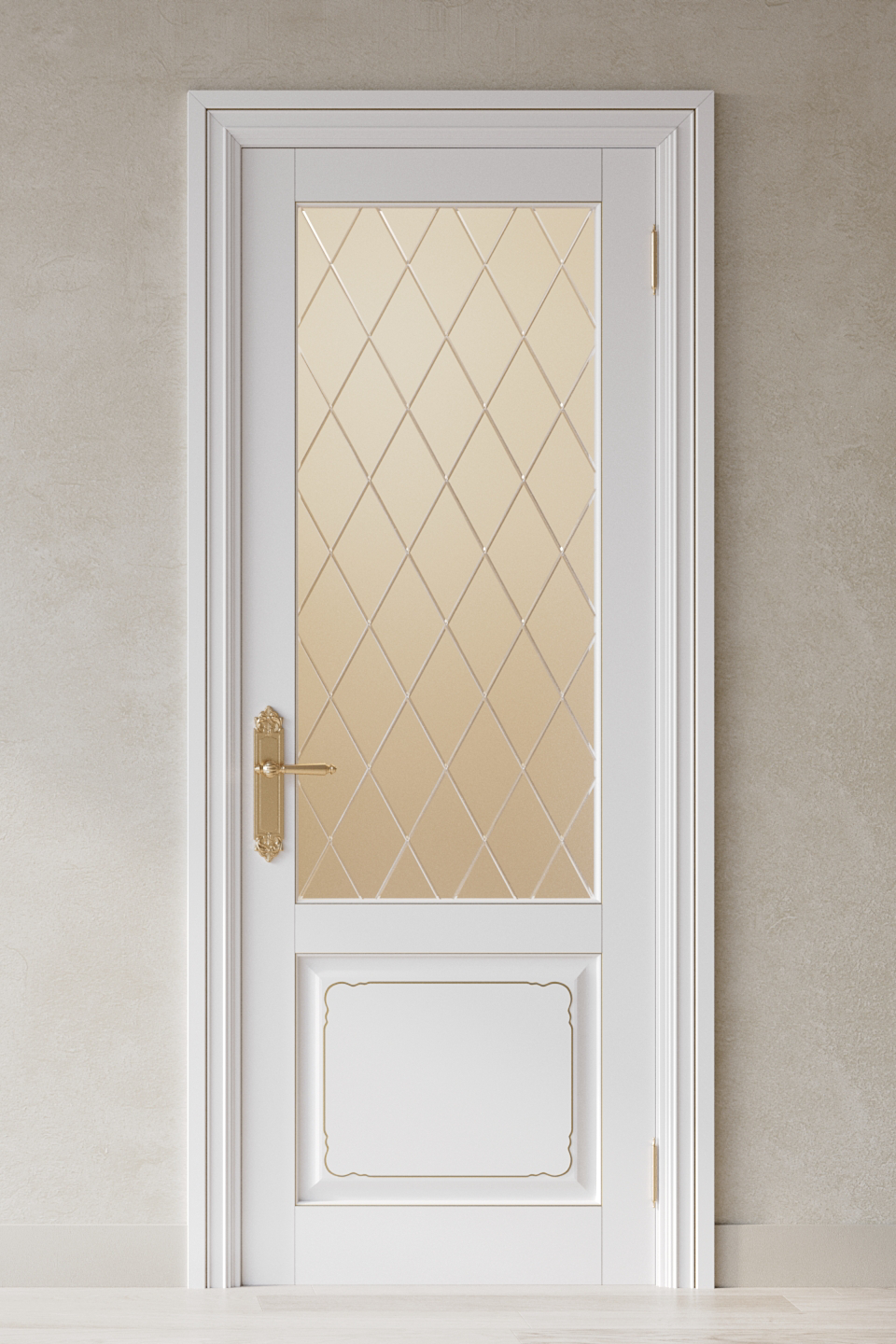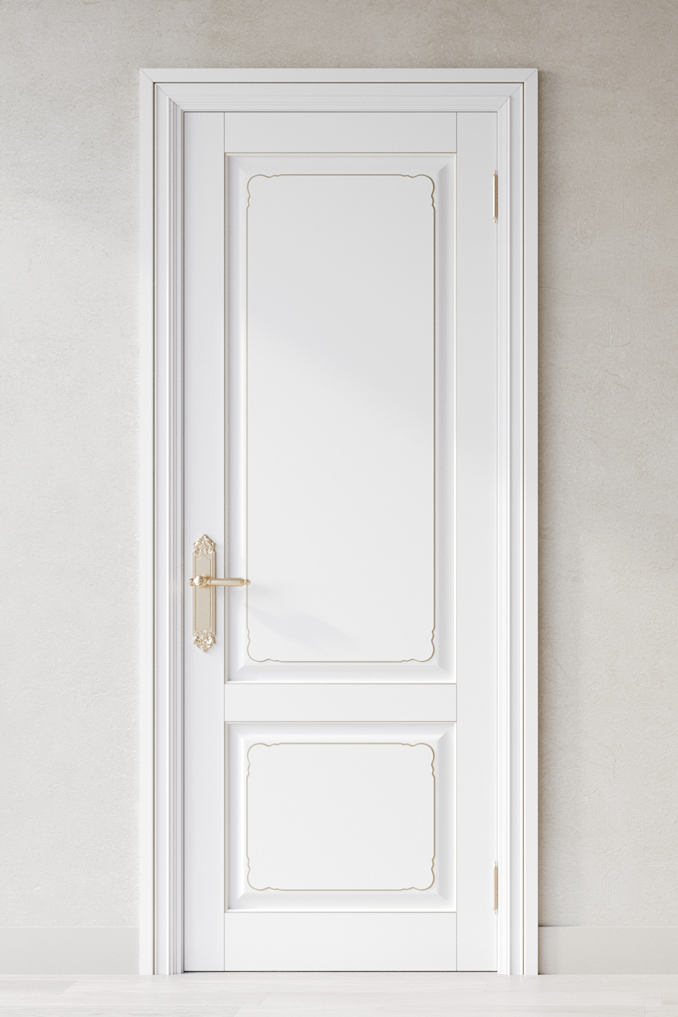 Дверь выполнена из массива бука, отделка эмаль. Линию фрезеровки на филенках можно дополнительно подчеркнуть патиной золотого или серебряного цвета.
