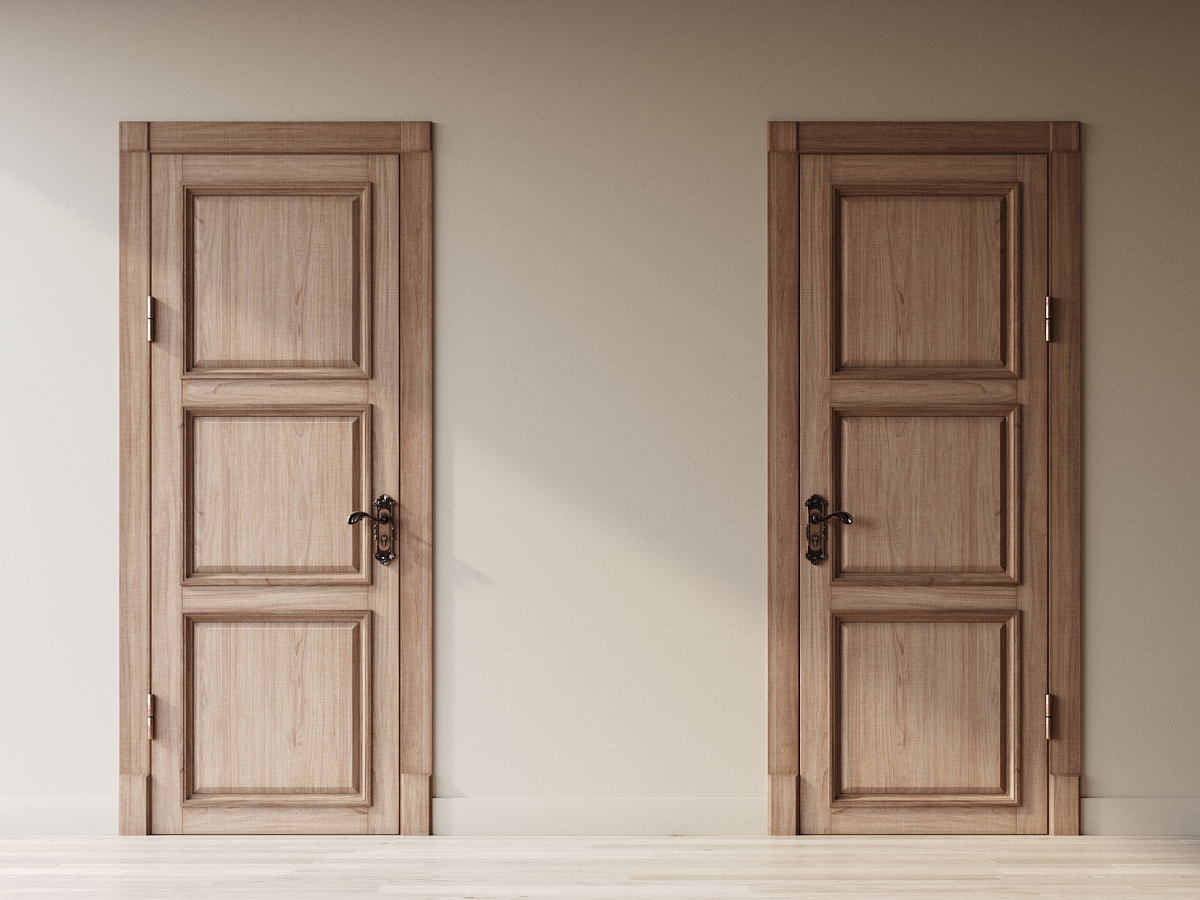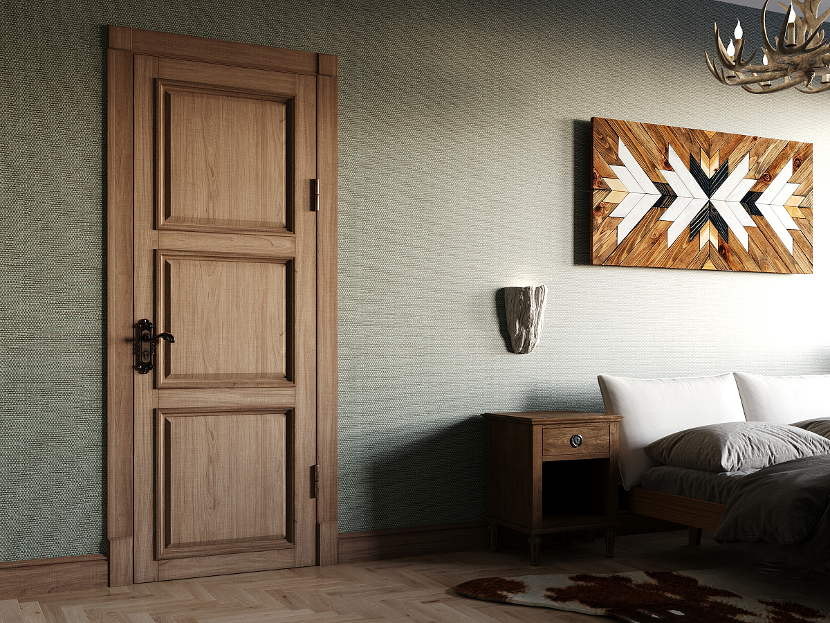 Дверь выполнена из цельноламельного массива дуба, отделка лаком Sayerlack. Полотно имеет особую специально посеченную, состаренную фактуру. Филенки обрамлены в багетную раму среднего размера.