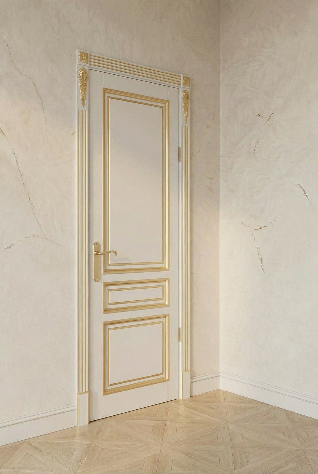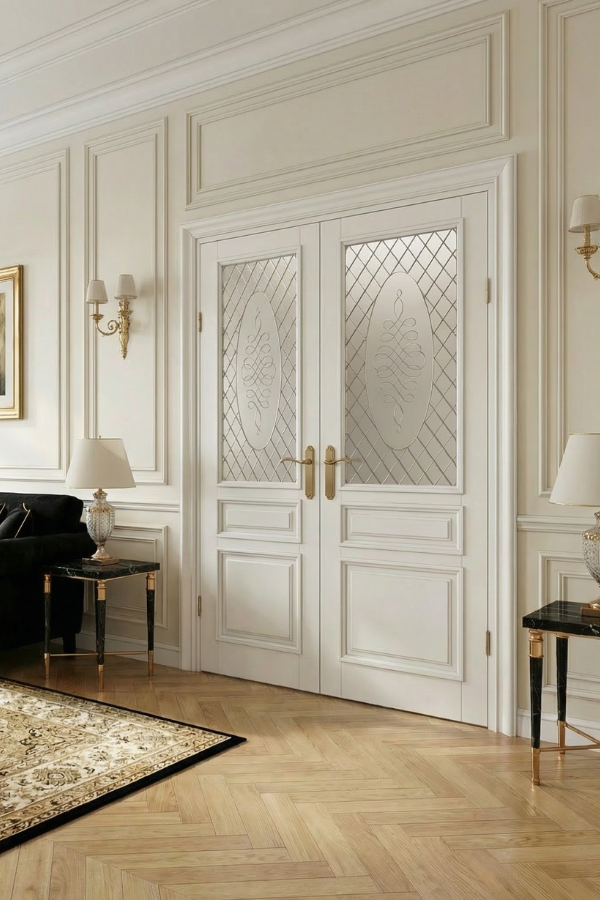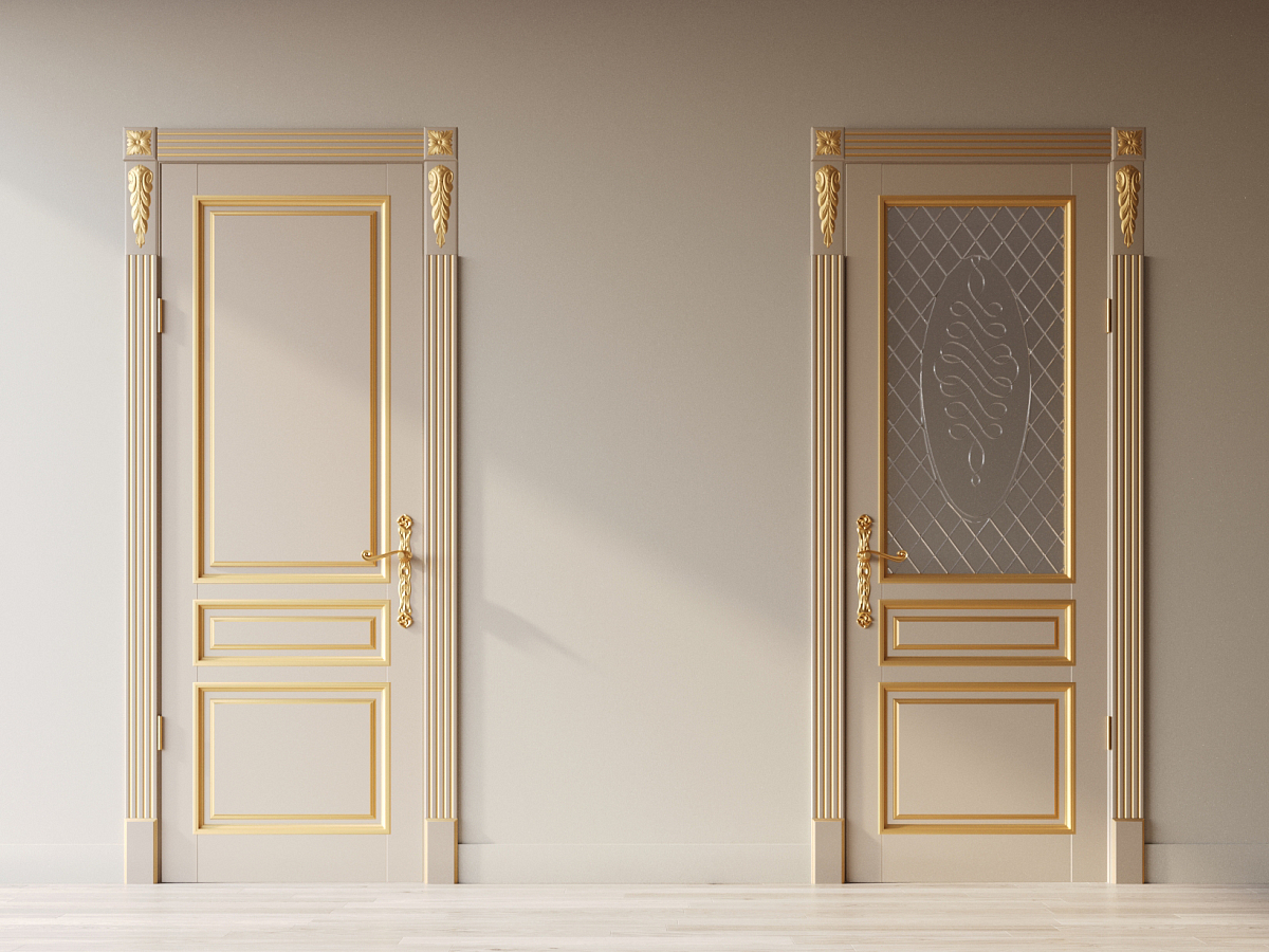 Филенки с багетными рамами украшают эту дверь из бука. Декоративные элементы можно подчеркнуть патиной золотого или серебряного оттенка. Покрытие - эмаль.
