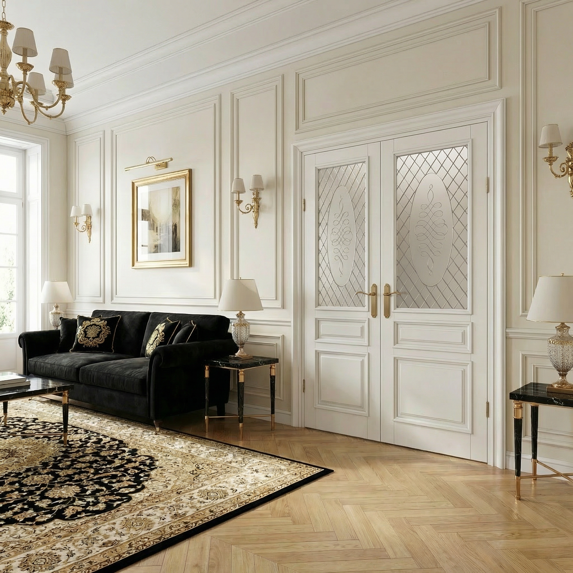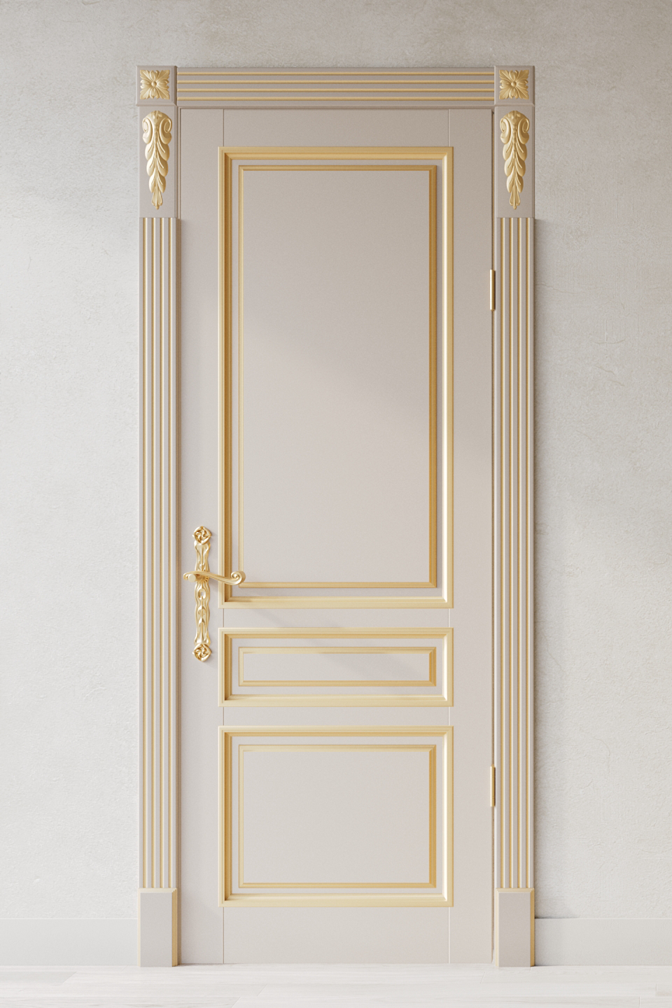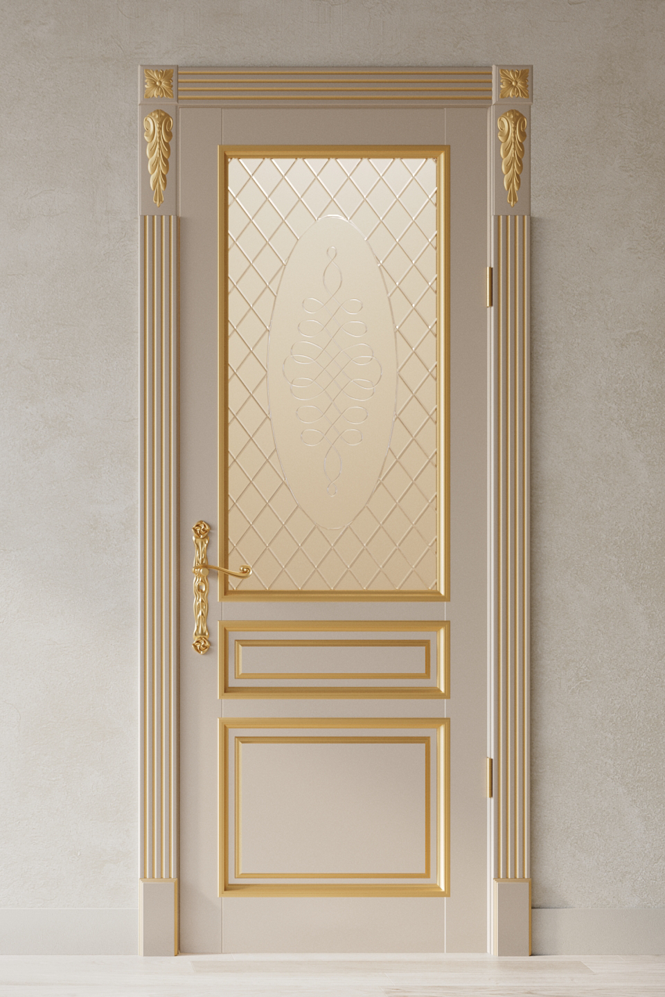 Филенки с багетными рамами украшают эту дверь из бука. Декоративные элементы можно подчеркнуть патиной золотого или серебряного оттенка. Покрытие - эмаль.