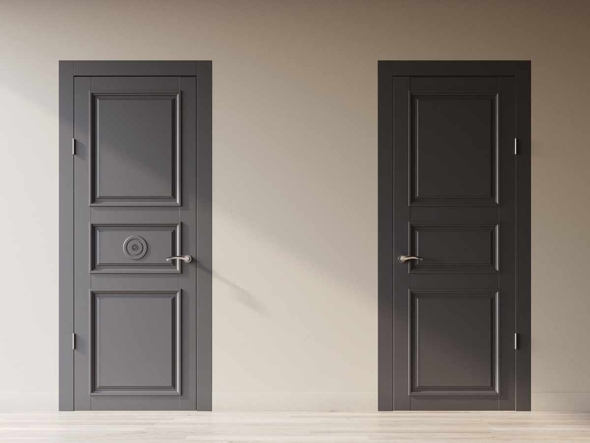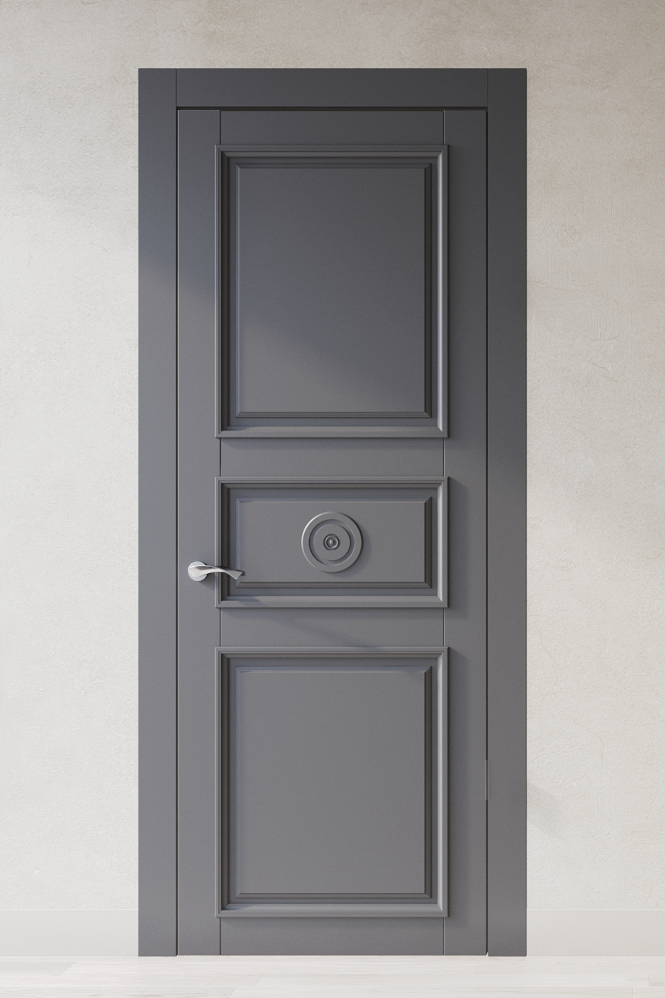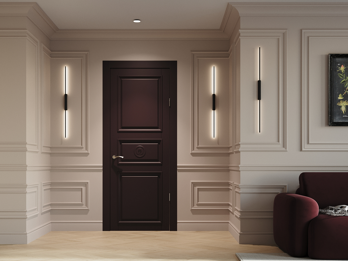 Дверь выполнена из цельноламельного массива дуба, отделка премиальным лаком Sayerlack. Филенки украшены объёмным багетом. Диаметр круга на филенке при любом размере полотна остается фиксированным.