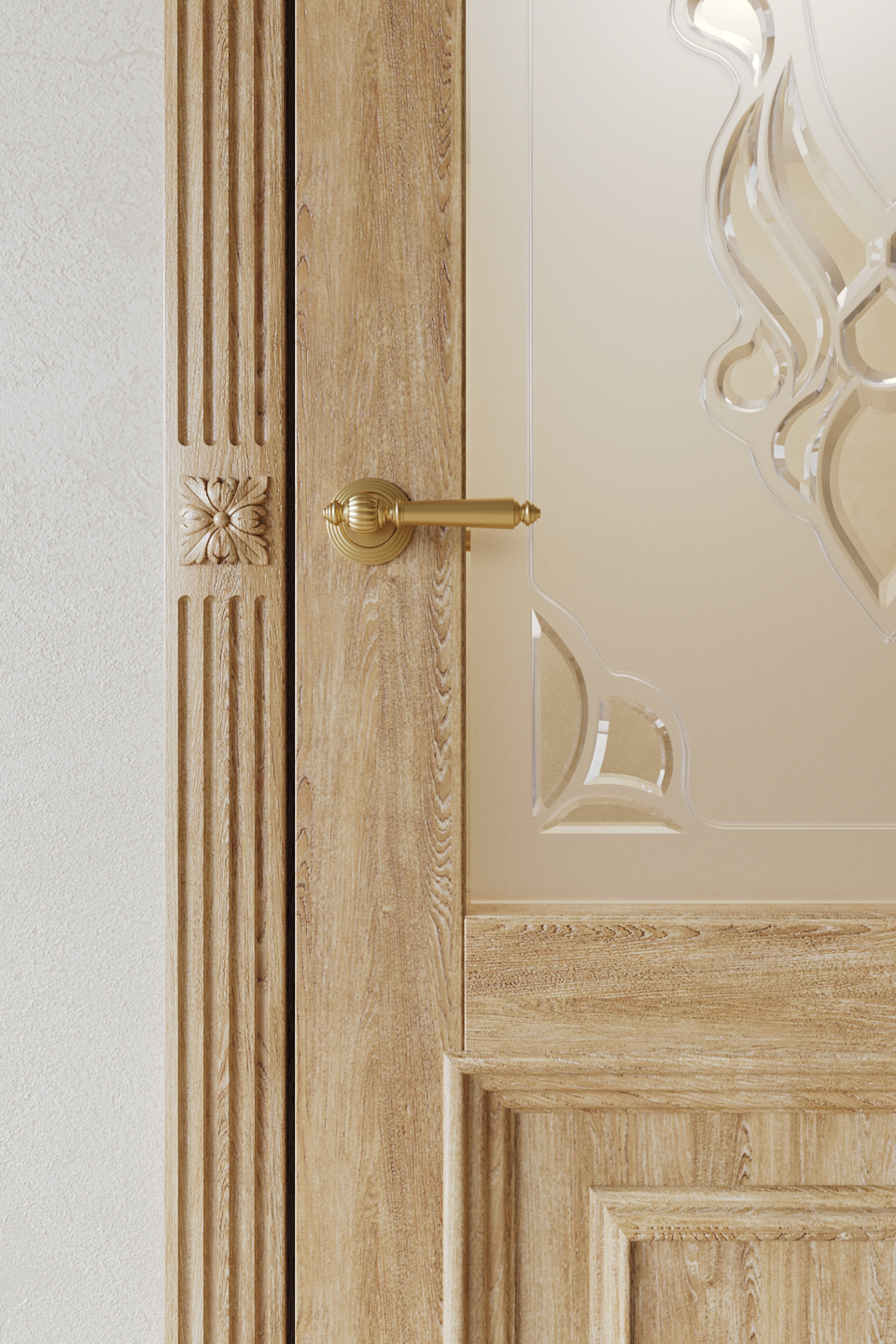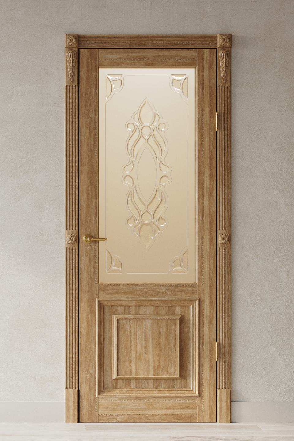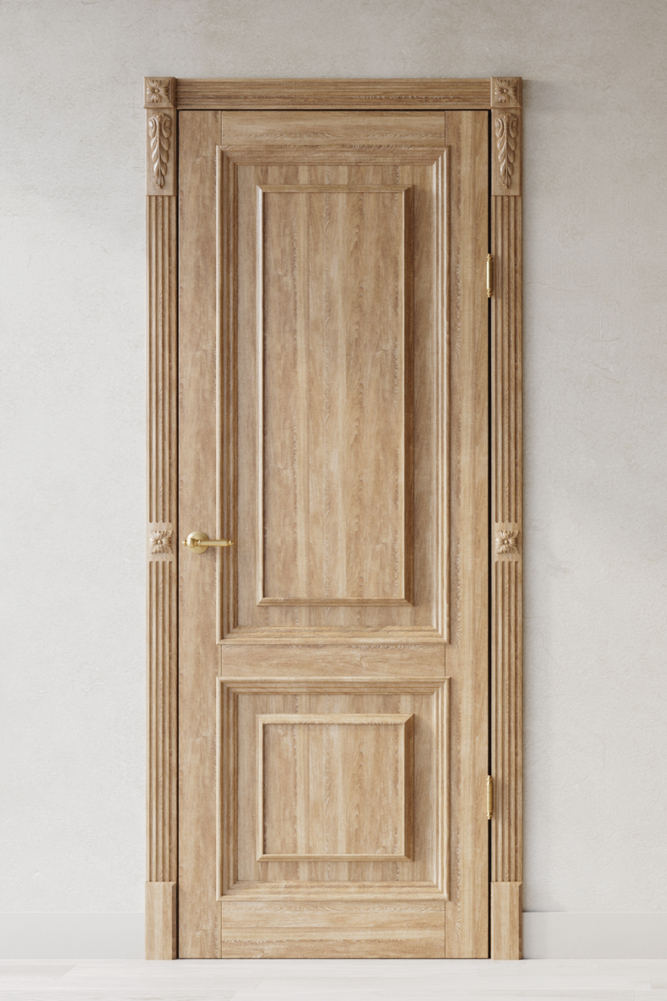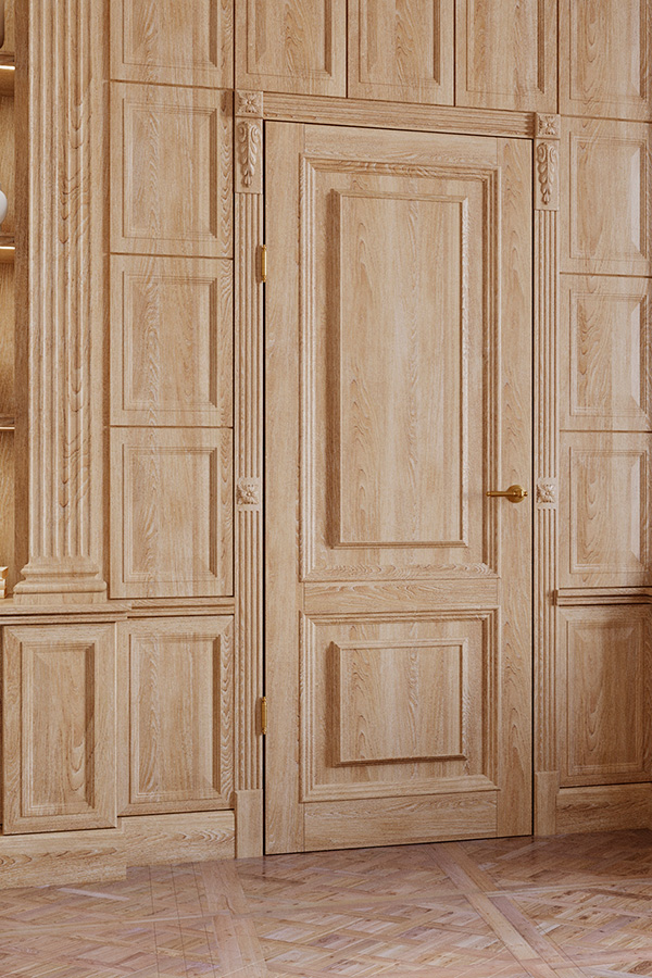 Дверь выполнена из цельноламельного массива дуба, внешняя отделка фирмы Sayerlack. Филенки украшены объёмным багетом.