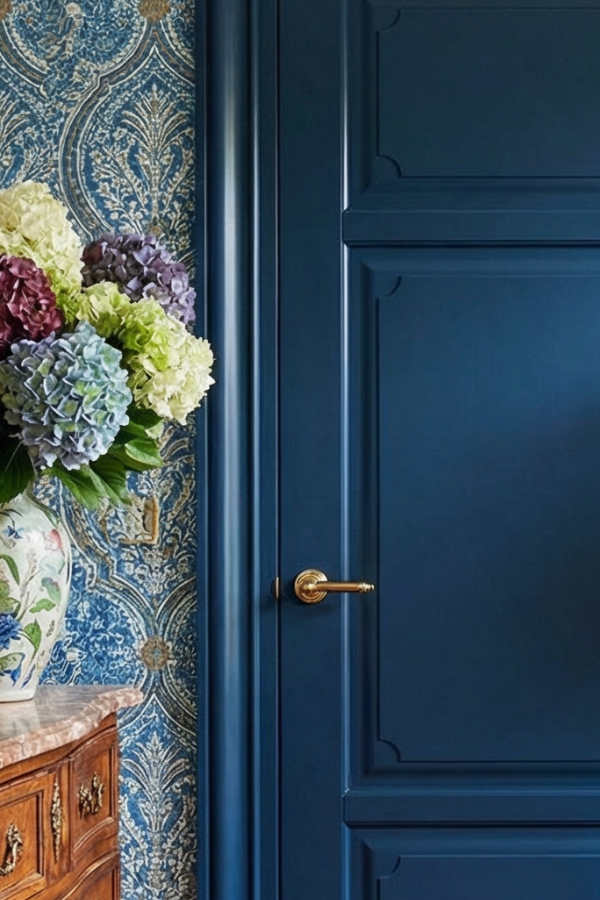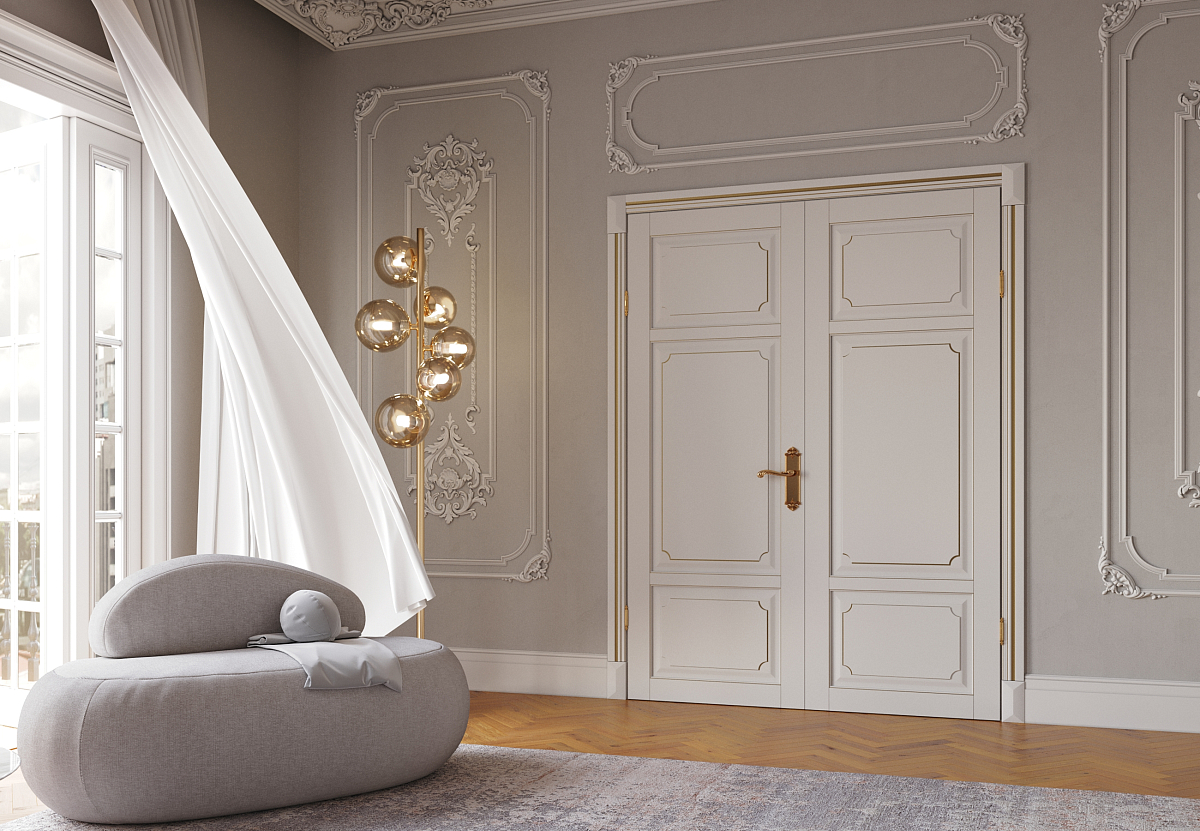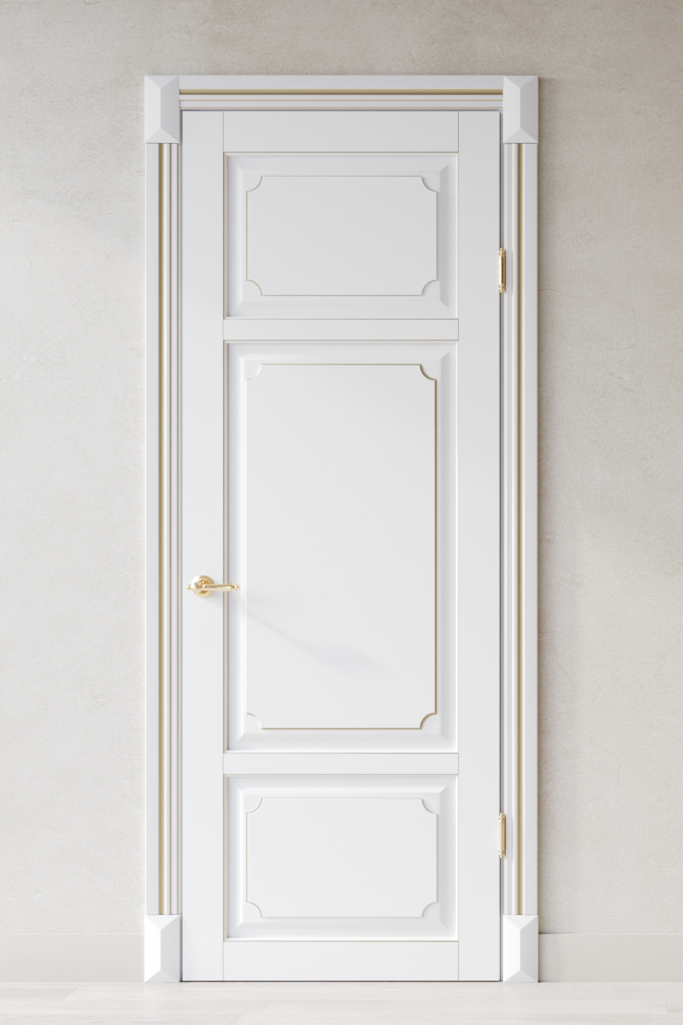 Филенчатая буковая дверь с эмалевым покрытием. Фрезеровку можно украсить золотистой или серебристой патиной.