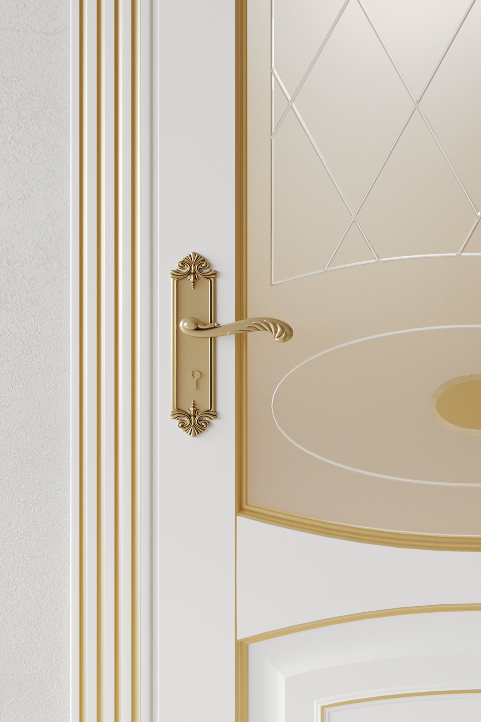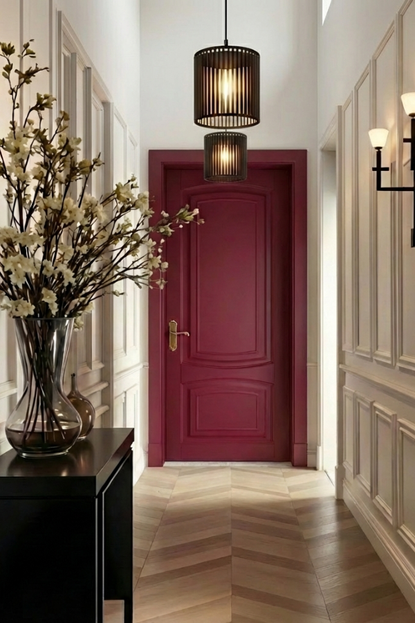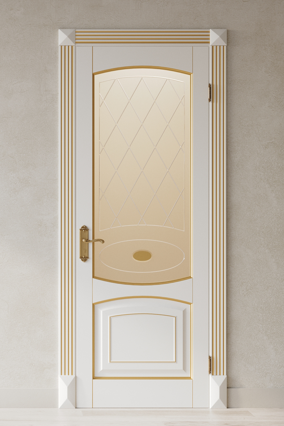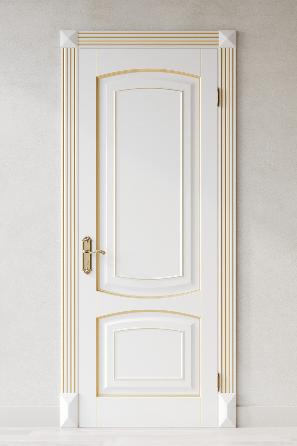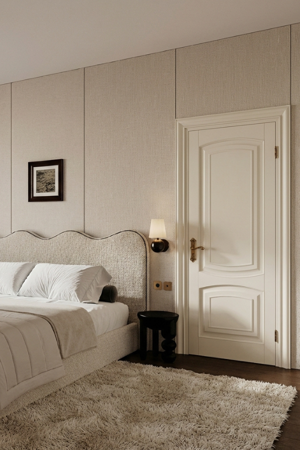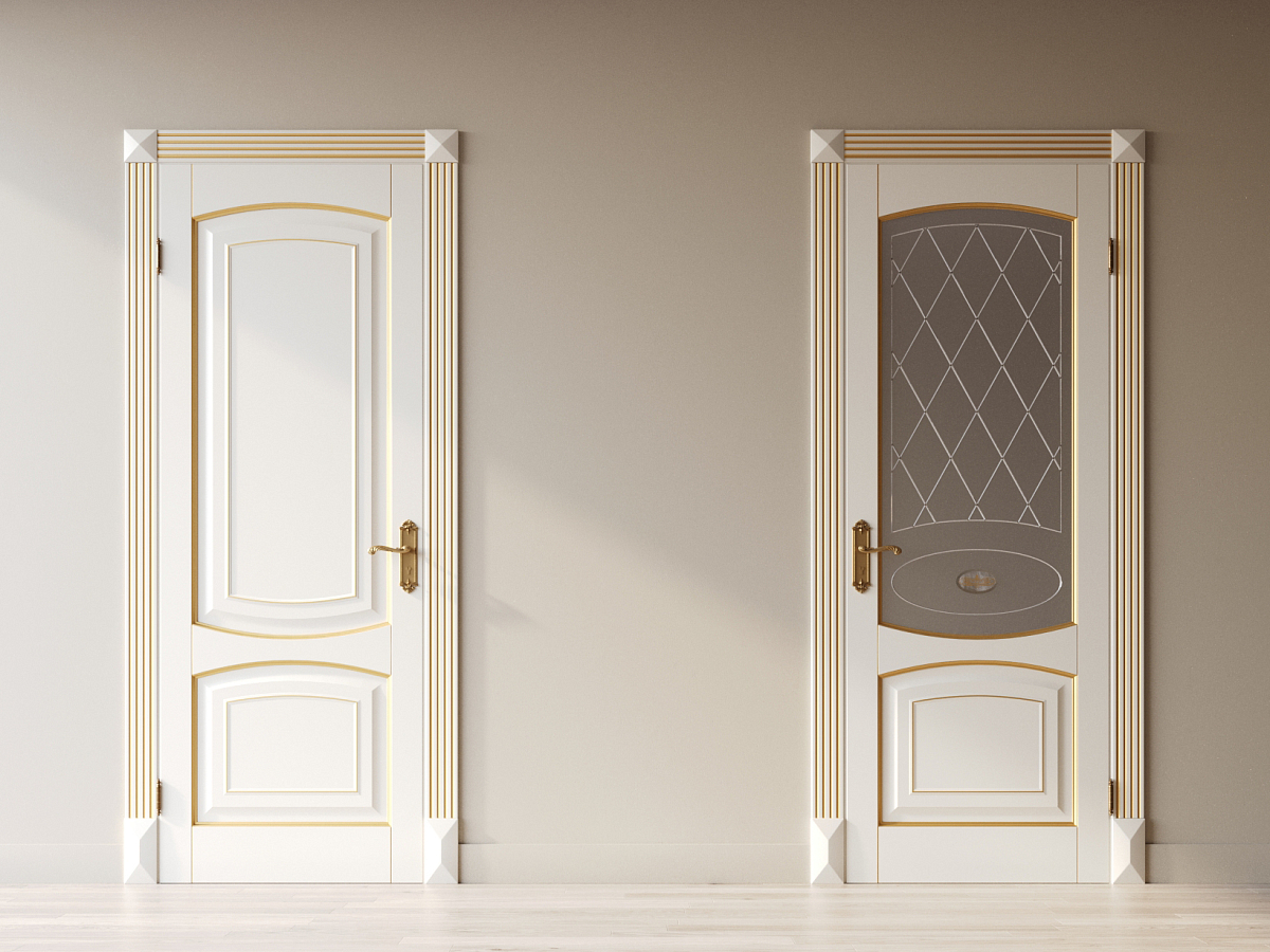 Филёнчатая дверь из бука в отделке эмаль. Патина золотого или серебряного оттенка подчеркнет окантовку на филенках.