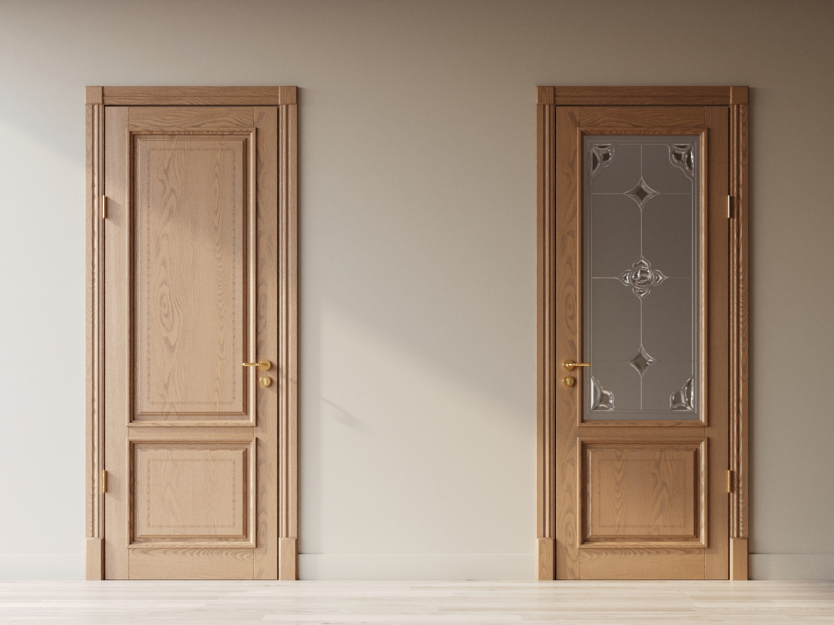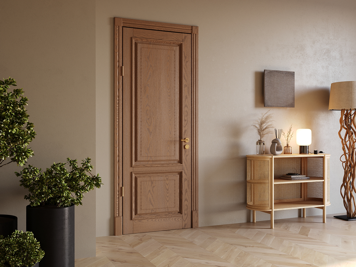 Роскошная дверь с резным орнаментом в виде косички. Для производства использован натуральный дуб, отделанный лаком Sayerlack. Оформлена рельефными багетами.