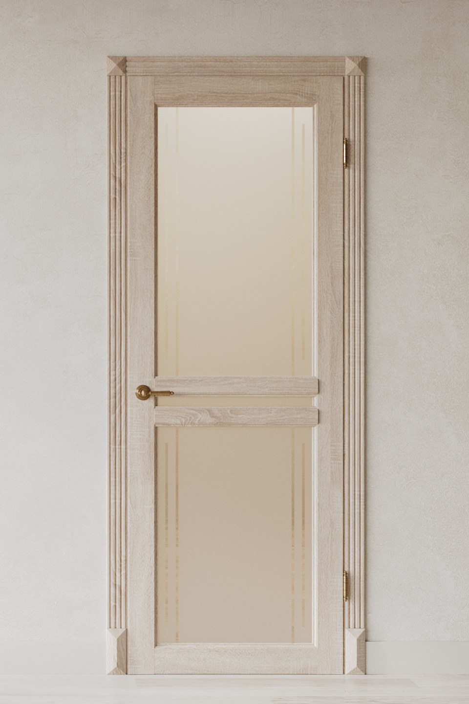 Возможно исполнение с плоскими (модерн) или объёмными филенками (классика). В глухом варианте полотна, мы устанавливаем матовое стекло, шириной 2 см, (от него можно отказаться и заменить на филенку). В пару к этой дверь можно выбрать остекленную модель, которую в свою очередь тоже можно сделать в двух вариантах. Стекло можно установить в верхнюю и нижнюю часть филенки одновременно, или остеклить только верхнюю часть.