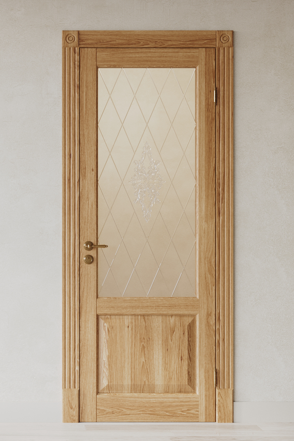 Строгая классическая модель, с прямыми формами и правильной пропорцией. Внутренние торцы обвязки с небольшой и не акцентной калевкой. Дверь выполнена из массива дуба. Нейтральные формы этой двери подойдут к любому интерьеру, и не будут притягивать на себя много внимания. Доступна и остекленная модель, для которой мы предлагаем классические ромбы, со сдержанным орнаментом в центре.
