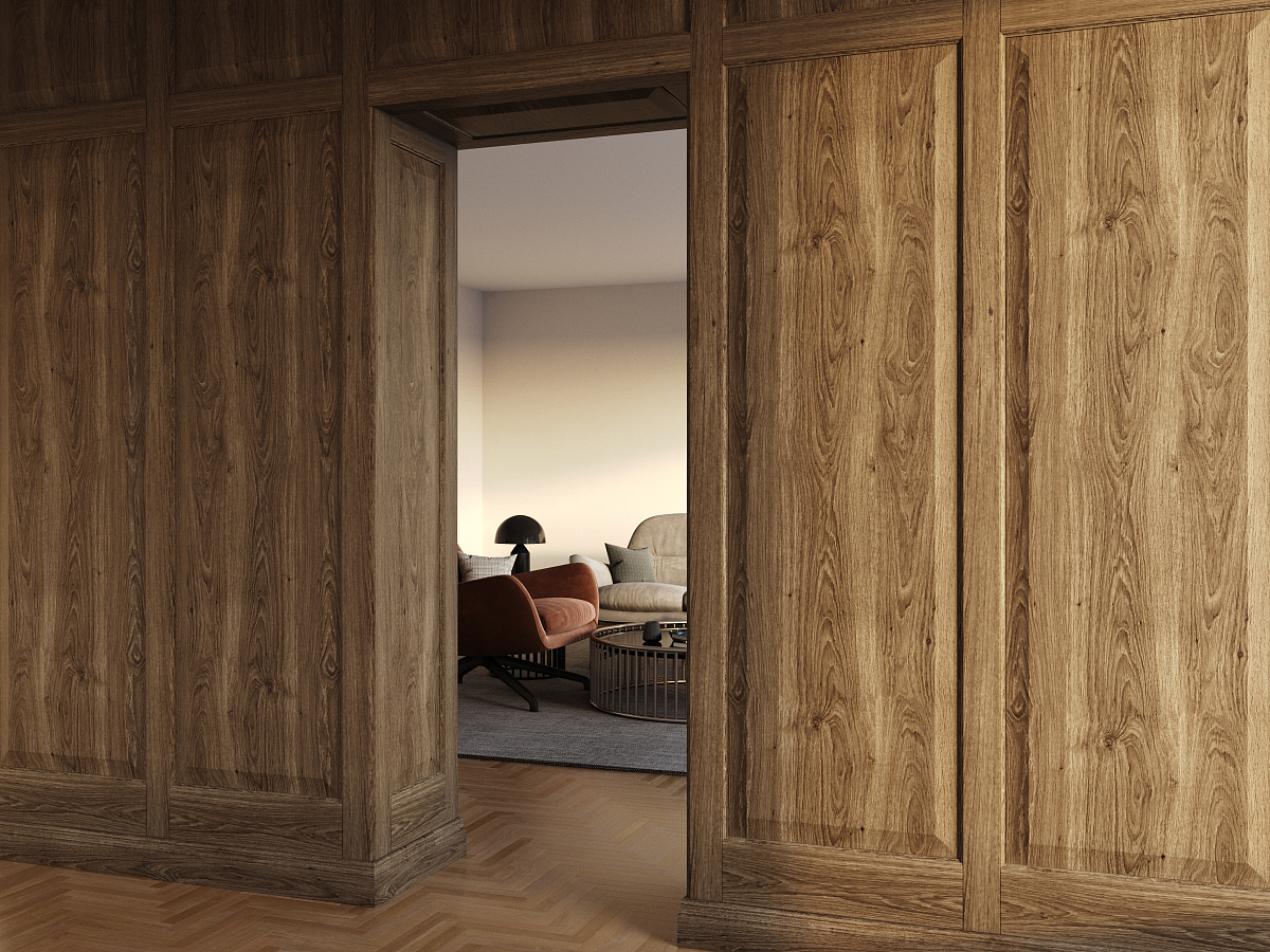 Для ощущения особой атмосферы используются панели и филёнчатые доборы из массива дуба. Функциональность и эстетика объединены в этом исполнении.