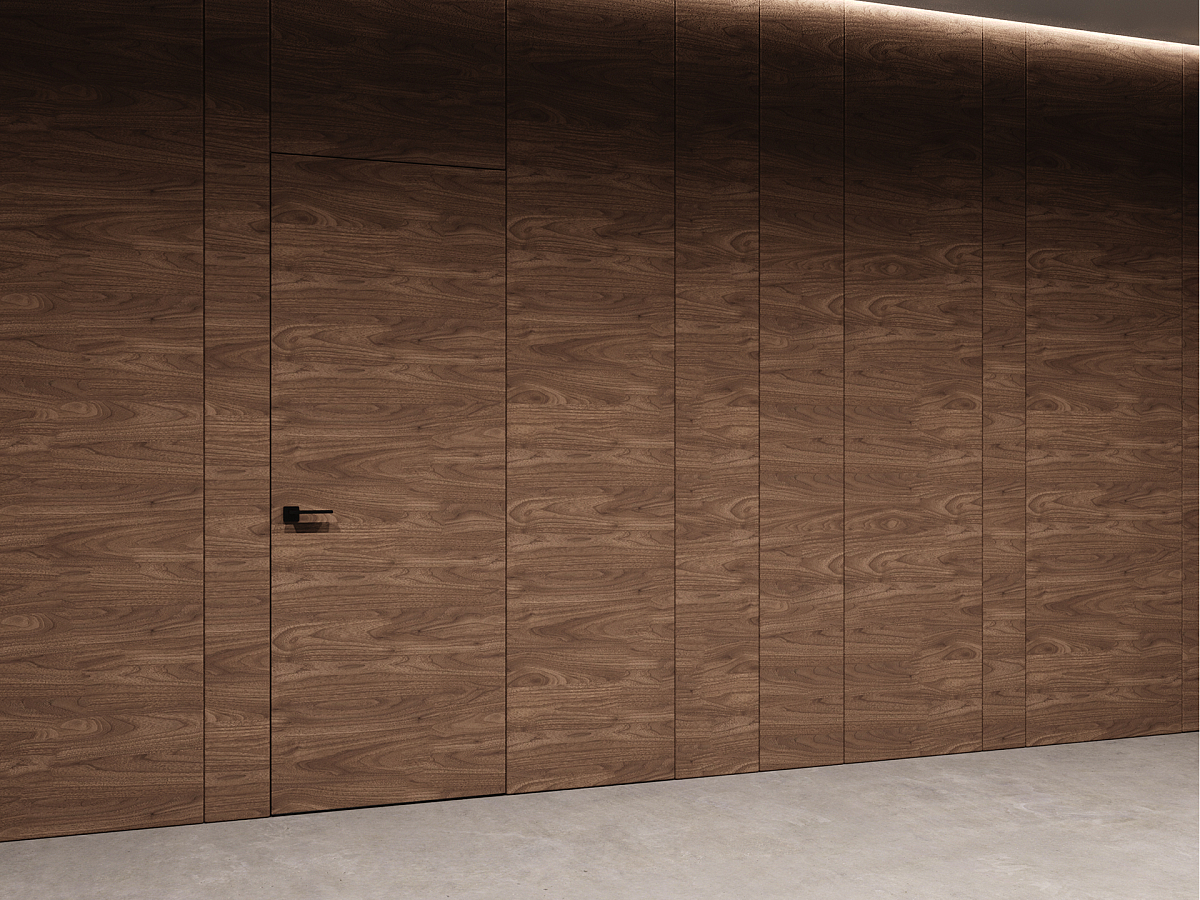 Дубовый натуральный шпон использован в облицовке панелей и доборов. На панелях может быть выполнена как вертикальная, так и горизонтальная раскладка.