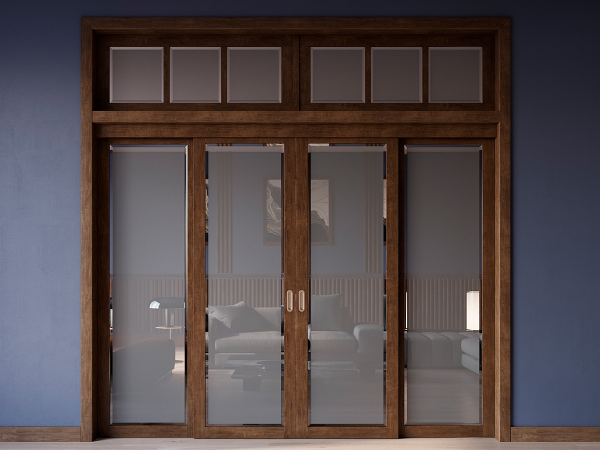 Перегородка может быть выполнена из цельноламельного массив дуба, инженерный массив дуба или массив бука. Способ раздвигания зависит от фурнитуры, и может быть любыми. Стекло прозрачное, матовое или с фацетом. Варианты установки и крепления могут быть разными.