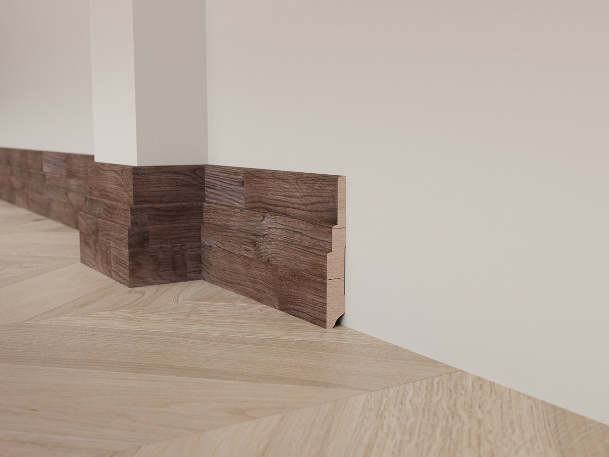 Форма плинтуса "две ступени". Изготовлен из инженерного массива дуба.